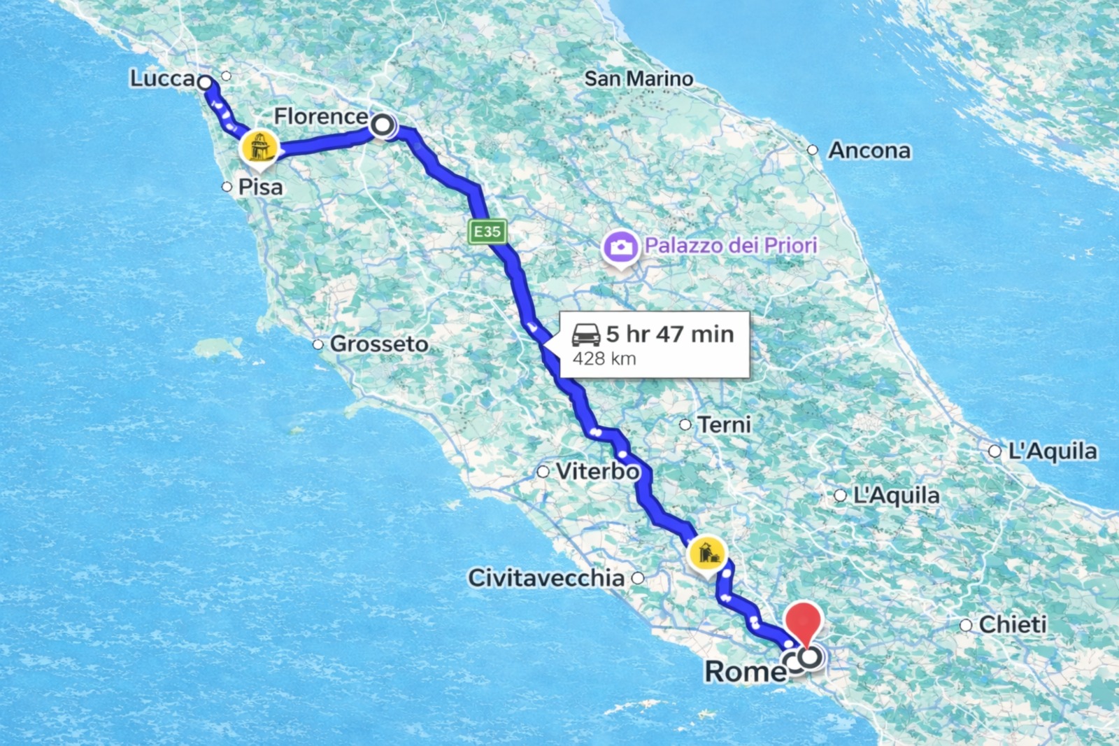 • Train travel between Rome, Florence, and Venice